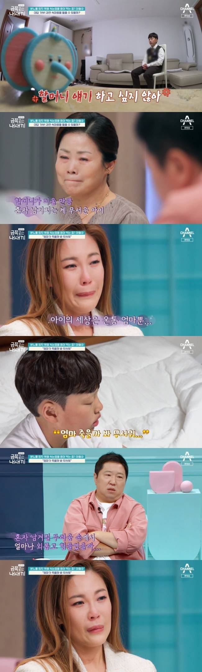 금쪽이가 할머니를 싫어한 이유는 할머니가 엄마를 데려갈 것 같은 공포때문이었다. 금쪽이는 “참으려고 머리나 눈썹을 뽑기도 한다. 나 중학생 되기 싫다. 초등학생 하고 싶다. 어리면 엄마랑 시간 더 보낼 수 있어서. 엄마가 이런 마음 몰라줘서 속상해. 엄마 죽을까 봐 무서워”라고 고백했다.