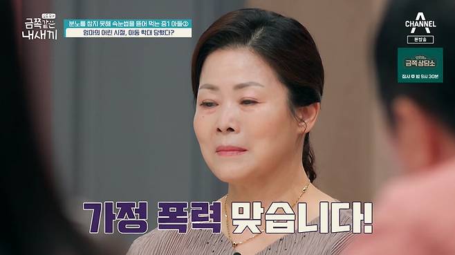 이날 금쪽이의 엄마는 "사실 초등학교 때 맞은 기억이 많다. 많이 맞았다. 엄마한테. 옷도 못 입고 쫓겨난 적도 있고, 종아리 피나게 맞아본 적도 있다"고 자신의 상처를 고백했다.