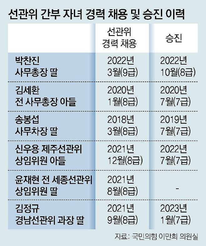 ‘아빠 찬스’ 의혹을 받는 선관위 간부 자녀 6명 중 5명은 입사 6∼16개월 만에 승진한 것으로 밝혀졌다. 국민의힘 이만희 의원이 26일 중앙선관위로부터 제출받은 자료에 따르면 박 사무총장 딸은 선관위에 9급으로 이직한 지 6개월여 만에 8급으로 승진했다. 김 전 사무총장 아들과 신우용 제주선관위 상임위원 아들은 선관위에 8급으로 이직한 지 6개월여 만에 7급으로 승진했다. 신 상임위원의 아들은 승진 직후 육아휴직을 쓰고 있다.