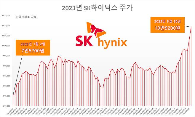 삼성전자가 우여곡절 끝에 26일 종가 기준 7만300원으로 ‘7만전자’에 도달했을 때, SK하이닉스는 ‘10만닉스’에 성큼 도달한 데 이어 ‘11만닉스’까지 코앞에 둔 상황까지 치고 올라갔습니다. 지난 26일 종가는 전거래일 대비 5.51% 오른 10만9200원에 형성됐습니다. 장중 11만원 선을 터치했다 장 막바지에 미끄러져 내려온 것이 아쉬웠을 따름이죠.