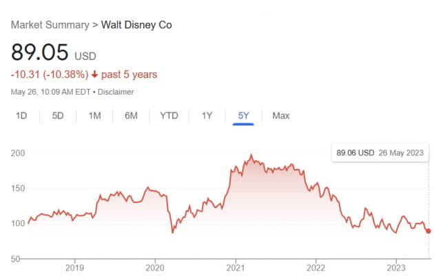 디즈니는 지난 26일 88.29달러에 거래를 마쳤습니다. 2021년 3월 고점(203달러)과 비교하면 52% 빠졌습니다. 넷플릭스가 올해 들어 20% 오르며 상승세를 타는 것과 대비됩니다.