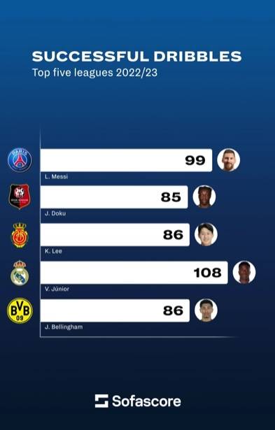 축구 통계 사이트 ‘소파 스코어’는 2022/23시즌 5대 리그 드리블 성공 TOP 5 선수 명단을 공개했다.