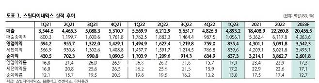 박성봉 하나증권 연구원은 27일 “스틸다이내믹스의 올해 1분기 매출액은 전분기 대비 1.4% 증가한 48억9000만달러, 영업이익은 10.0% 증가한 8억3000만달러로 집계됐다”고 설명했다.