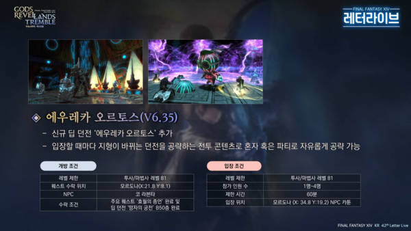 데미지에 피해 종류가 표시된다. 어떤 생존기를 올려야할지 한눈에 확인할 수 있게 된다. 아울러 파티목록에 강화 및 약화 남은 시간이 표시되도록 변경된다. 시너지 관리와 연계를 더욱 편하게 할 수 있다. 다만, 컴퓨터 사양에 따라 부하가 있을 수 있다. 아울러 '종극의 결전' 탈것 드롭율 상향, 딥 던전 내용 일부 변경, 무작위 임무 변경 등이 적용될 예정이다.