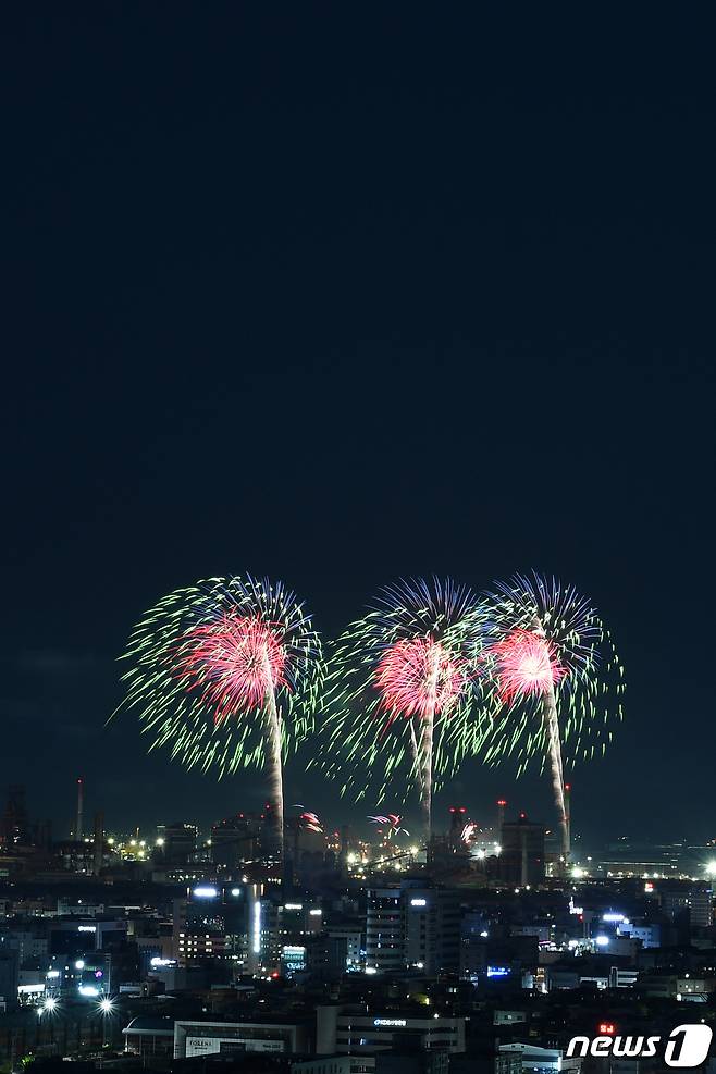 (포항=뉴스1) 최창호 기자 = 27일 경북 포항시 남구 형산강 체육공원에서 '2023포항국제불빛축제' 메인 행사인 국제불꽃쇼가 펼쳐지고 있다. 2023.5.27/뉴스1