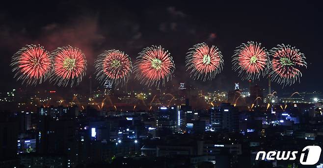 (포항=뉴스1) 최창호 기자 = 27일 경북 포항시 남구 형산강 체육공원에서 '2023포항국제불빛축제' 메인 행사인 국제불꽃쇼가 펼쳐지고 있다. 2023.5.27/뉴스1
