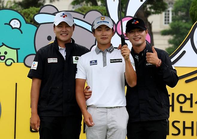 [서울=뉴시스] 조성봉 기자= 27일 경기도 이천 블랙스톤 이천 GC에서 열린 KB금융 리브챔피언십 3라운드 1번홀에서 김민규, 김동민, 배용준이 기념촬영을 하고 있다. (사진=KPGA 제공) 2023.05.27. photo@newsis.com *재판매 및 DB 금지