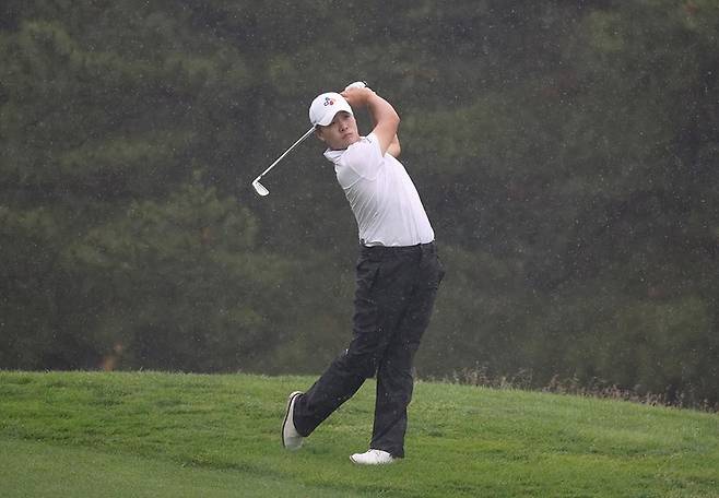[서울=뉴시스] 조성봉 기자= 27일 경기도 이천 블랙스톤 이천 GC에서 열린 KB금융 리브챔피언십 3라운드 5번홀에서 김민규가 세컨 아이언 샷을 하고 있다. (사진=KPGA 제공) 2023.05.27. photo@newsis.com *재판매 및 DB 금지