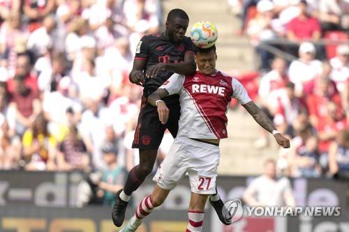 Bayern's Dayot Upamecano, top, and Cologne's Davie Selke challenge for the ball during the German Bundesliga soccer match between 1. FC Cologne and FC Bayern Munich in Cologne, Germany, Saturday, May 27, 2023. (AP Photo/Matthias Schrader) The Deutsche Fussball Liga DFL does not allow the images to be used as sequences to emulate video.