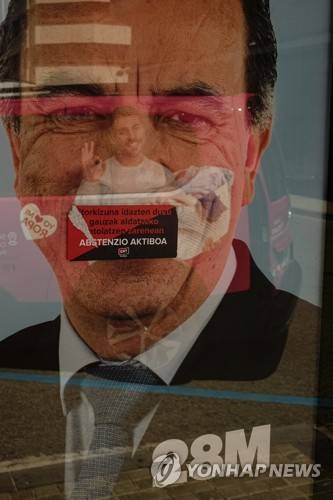 A sticker calling for abstention partially covers an electoral poster for May's regional Spanish elections, in Pamplona, northern Spain, Saturday, May 27, 2023. On Sunday, May 28, Spain will be celebrating regional and local elections along of the country. (AP Photo/Alvaro Barrientos).