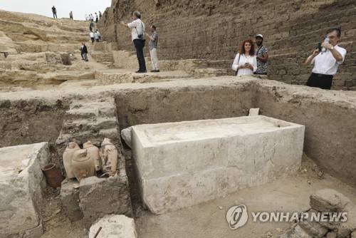 epa10657571 People stand next to canopic jars as they visit the newly-discovered burial site in Saqqara, Giza Governorate, Egypt, 27 May 2023. Egyptian antiquities authorities have unveiled ancient workshops and tombs at the Saqqara necropolis, outside the capital Cairo. Saqqara is one of the most important burial sites of ancient Egypt and a UNESCO World Heritage site. EPA/KHALED ELFIQI