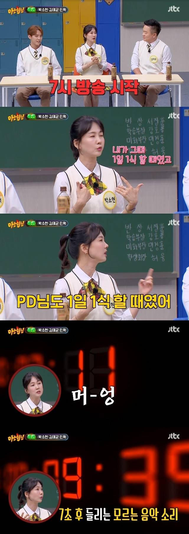 이를 들은 박소현은 "이 PD님과 내가 '러브게임'을 할 때 7시가 됐는데 그때 내가 1일 1식 할 때였고 그 PD님도 1일 1식을 했다. 우리 둘 다 (멍하니) 가만히 있었는데 7초 뒤 모르는 음악이 나오니 '어 이게 뭐지?' 인지했을 땐 이미 20초가 넘어갔다"고 비슷한 경험을 전했다.