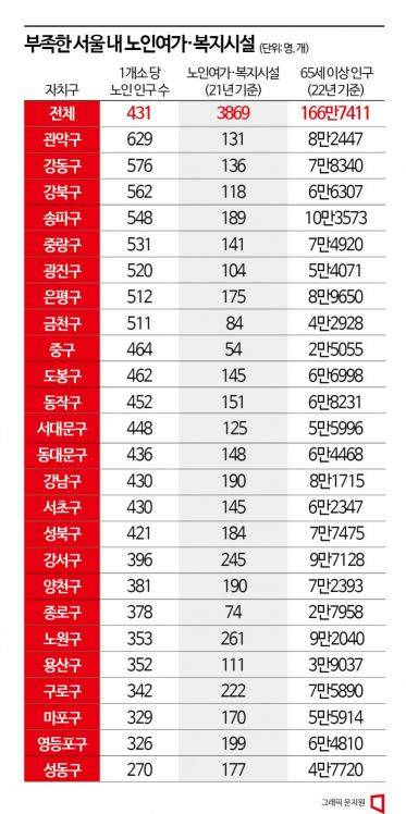 수 자체도 부족한 현실이다. 서울시에 따르면 2021년 기준 서울 내 전체 노인여가·복지시설은 3869개다. 현재 서울시 내 65세 이상 고령인구 수는 166만7411명으로 시설 1개소는 평균 430명의 노인을 소화해야 한다. 자치구별로 보면 격차가 뚜렷하다. 관악구의 노인여가·복지시설들은 1개소당 629명의 노인을 받아야 한다. 이어 강동구(576명), 강북구(561명), 송파구(548명) 순이었다. 성동구와 영등포구, 마포구는 각각 1개소당 270명, 326명, 329명만 소화하면 되는 것과 비교된다.