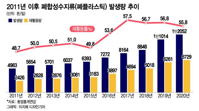 플라스틱 폐기물에 대한 경고등이 켜졌지만 코로나19 시대를 지나오면서 오히려 폐기물 발생량은 증가했다. 본격적인 코로나19 유행 이전인 2019년 플라스틱 폐기물 발생량은 1만1014톤인 점과 비교하면 1년새 9.4% 증가했다.