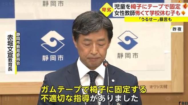 현지시간으로 24일 FNN 등 현지 매체 보도에 따르면 전날 일본 시즈오카현 시즈오카시 교육위원회는 "관내 초등학교에 근무하는 교사가 수업 중 학생의 허벅지를 접착테이프로 의자에 고정하는 부적절한 지도를 했다"며 사과했습니다.