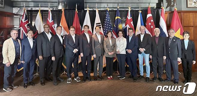 (서울=뉴스1) = 안덕근 산업통상자원부 통상교섭본부장(왼쪽 일곱번째)이 27일(현지시간) 미국 디트로이트에서 열린 인도태평양경제프레임워크(IPEF) 장관회의에서 참석자들과 기념촬영을 하고 있다. (산업통상자원부 제공) 2023.5.28/뉴스1