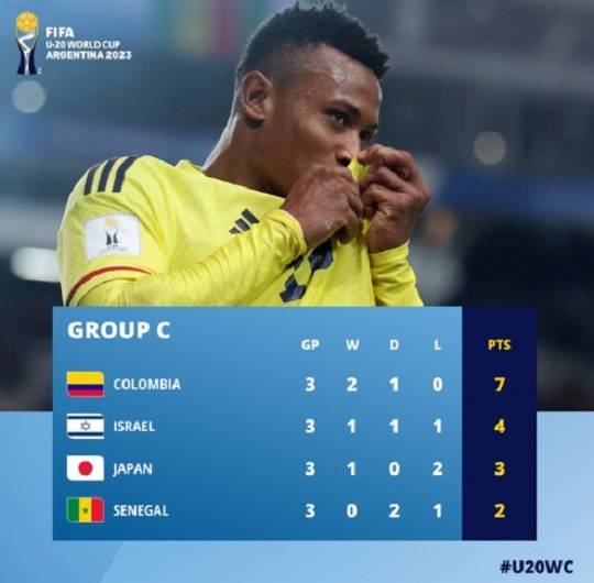 C조 최종 순위는 다음과 같다. 1위 콜롬비아(2승 1무), 2위 이스라엘(1승 1무 1패), 3위 일본(1승 2패), 4위 세네갈(2무 1패). U20 월드컵은 6개 조의 1위와 2위 팀이 16강에 직행하고, 6개 3위 팀 중 성적이 높은 4개 팀이 16강에 갈 수 있다.