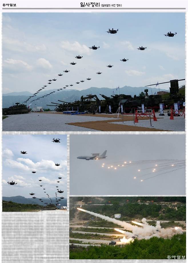 작은 사진은 E-737(피스아이) 공중조기경보통제기가 상공에서 플레어(섬광탄)를 발사하는 장면과 다연장로켓포(MLRS)의 훈련 장면 입니다. “사랑도 인생도 타이밍” 이라는 말이 있듯 ‘뉴스에도 타이밍이 있다’고 기자는 말하고 싶습니다. 24일 누리호 발사가 하루 연기되면서 블랙이글스 뉴스는 더 부각이 되었고 한미화력격멸훈련 관련 뉴스는 상대적으로 덜 부각이 되지 않았나 생각듭니다. 아무튼 멋찐 훈련을 보여준 한미합동격멸훈련을 응원하고 든든한 감정을 가지게 됩니다.