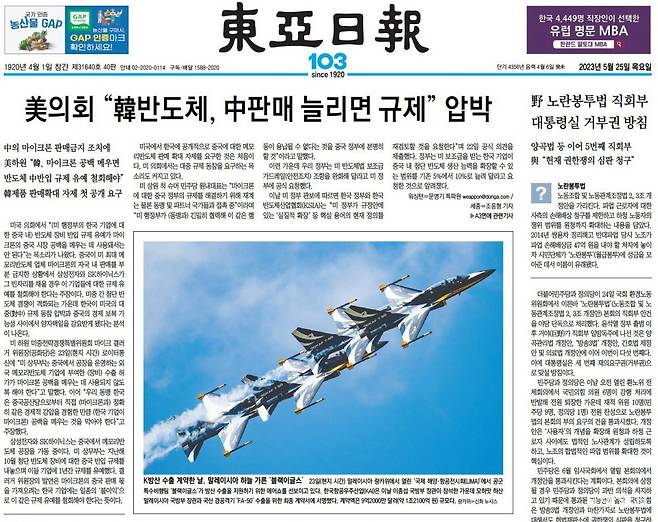 ▷두번째 비행 23일(현지 시간) 말레이시아 랑카위에서 열린 ‘국제 해양·항공전시회(LIMA)’에서 공군 특수비행팀 ‘블랙이글스’가 방산 수출을 지원하기 위한 에어쇼를 선보였습니다. 한국항공우주산업(KAI)은 이날 이종섭 국방부 장관이 참석한 가운데 모하맛 하산 말레이시아 국방부 장관과 국산 경공격기 ‘FA-50’ 수출을 위한 최종 계약서에 서명(9억2000만 달러, 약 1조2100억 원) 했습니다. 아래 이미지는 23일 블랙이글스의 비행 사진이 담긴 동아일보 5월25일자 1면 입니다.