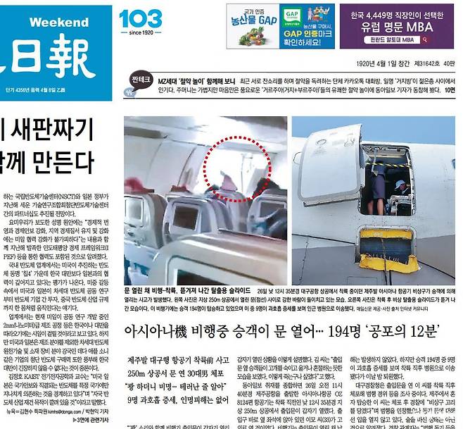 아찔한 순간을 만든 이 남성에게 대구 동부경찰서는 27일 오후 항공보안법 위반 등 혐의로 구속영장을 신청했습니다. 조사에서 남성은 “최근 실직 후 스트레스를 받아오고 있었다” “비행기 착륙 전 답답해 빨리 내리고 싶어서 문을 열었다”고 진술했습니다. 항공보안법 23조에 따르면 항공기 내에서 출입문, 탈출구, 기기의 조작을 한 승객은 10년 이하의 징역형에 처할 수 있다고 합니다. 황당한 비행 뉴스를 ‘여섯번째 비행’으로 소개했습니다.