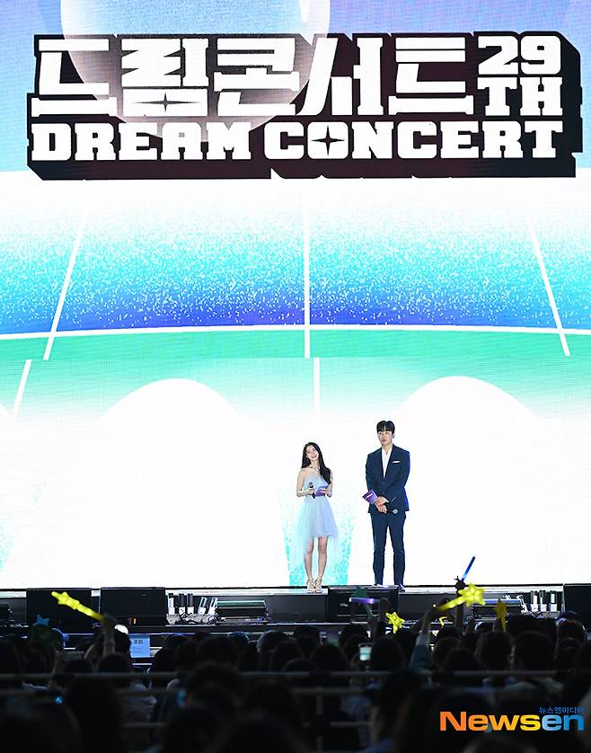 MC를 맡은 오마이걸 유빈, 아나운서 조정식이 5월 27일 오후 부산광역시 연제구 아시아드주경기장에서 열린 ‘제29회 드림콘서트’에서 중간 인사를 하고 있다.