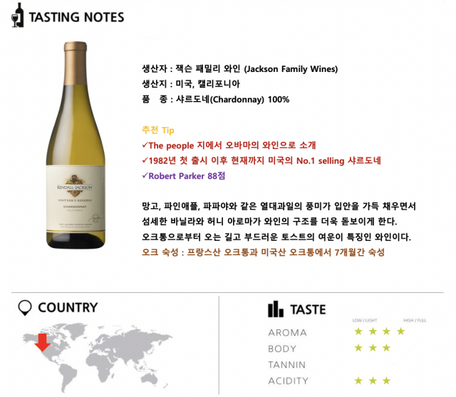 캔달잭슨 빈트너스 리저브 샤르도네는 1982년 첫 출시 이후 현재까지 미국 샤르도네 최다 판매를 자랑한다. 캔달 잭슨 와인을 접한 미국인들은 모두 “This is U.S.A.(이것이 미국이다)”고 말한다고 한다. 버락 오바마 전 미국 대통령이 인터뷰에서 집에서 즐겨 마시는 와인으로 캔달잭슨 빈트너스 리저브 샤르도네를 꼽아 ‘오바마의 와인’으로 이름을 떨쳤다. 팝 가수 레이디 가가가 콘서트를 다닐 때마다 공연장 대기실에서 즐겨 마시는 것으로도 유명하다.