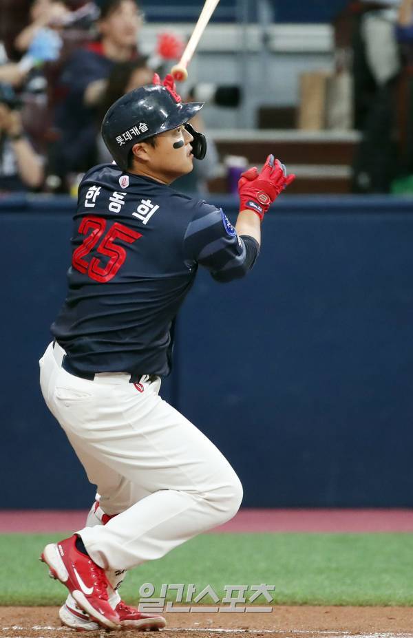 2회초 1사 1,3루 한동희가 추가점을 올리는 희생플라이를 치고 있다.