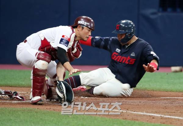 2회초 1사 1,3루 한동희의 희생플라이 때 3루주자 유강남이 홈인하고 있다.