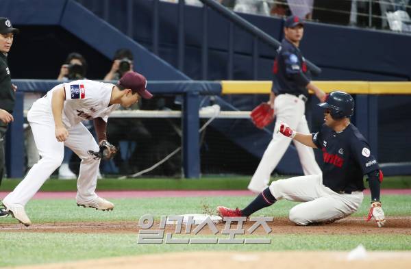 3회초 2사 전준우가 3루타를 치고 베이스에 여유있게 도착하고 있다.