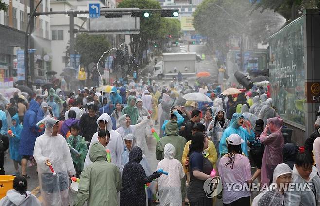 (춘천=연합뉴스) 강태현 기자 = 제35회 춘천마임축제가 열린 28일 강원 춘천시 새명동거리와 시청 광장 일대에서 '물의도시:아!水라장' 프로그램이 열리고 있다. 시민들은 도심 거리에서 공연자와 참가자가 팬데믹의 끝을 알리는 의미를 담아 물을 쏘며 축제를 즐기고 있다. 2023.5.28