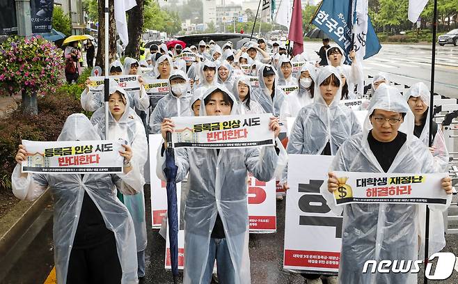 이들은 이날 등록금 인상 반대, 학식 가격 인하, 대학 통폐합 반대 등을 촉구하며 서울역 까지 행진했다. 2023.5.28/뉴스1