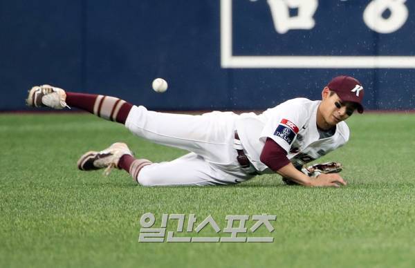 6회초 2사 윤동희의 타구를 중견수 이정후가 몸을 날려 잡으려 했지만 잡지 못하고 있다.