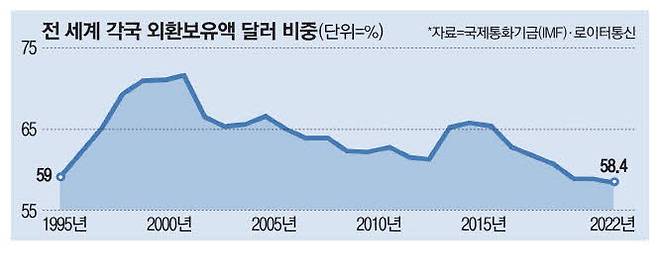 최근 로이터통신은 국제통화기금(IMF)의 자료를 인용해 세계 각국 중앙은행의 외환보유액에서 달러 비중이 지난해 4분기 기준 58%를 기록했다고 보도했다. 1995년 59% 이후 약 20년 만에 최저치로 추락했다. 로이터통신은 미·중 경쟁과 우크라이나 전쟁, 미국 연방정부의 부채 한도 위기가 이 같은 추세를 이끌었으며, 서방의 대러시아 금융 제재 등이 달러화 비중 하락을 부채질했다고 분석했다. 스티븐 젠 유리존SLJ캐피털 최고경영자(CEO)는 로이터통신을 통해 "지난해 달러 비중이 급격히 하락한 것은 우크라이나 침공 이후 러시아의 금과 외화자산 6400억달러 중 절반이 동결된 데 따른 반응"이라고 밝혔다.