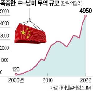 28일 파이낸셜타임스(FT)에 따르면 중국과 남미 국가 간 무역 규모는 2000년 120억달러(약 16조원)에서 2022년 4950억달러(약 656조원)로 늘어났다. 22년 동안 41배로 불어난 셈이다.