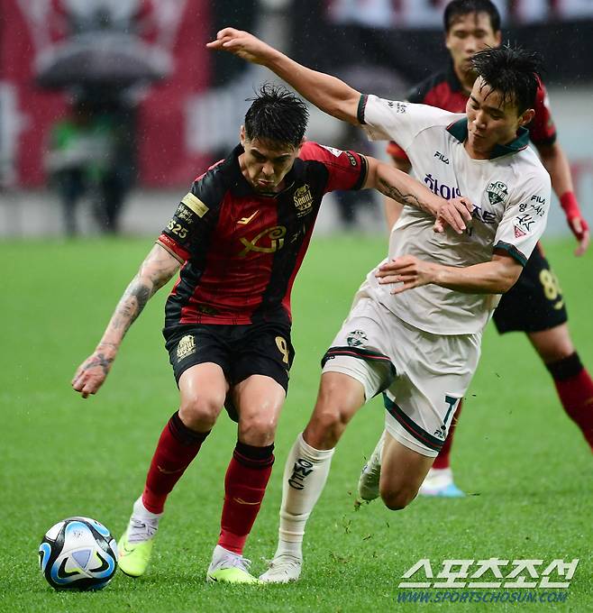프로축구 K리그1 FC서울과 강원FC의 경기가 28일 서울월드컵경기장에서 열렸다. FC서울 윌리안과 강원FC 양현준이 볼을 다투고 있다. 상암=최문영 기자 deer@sportschosun.com/2023.05.28/