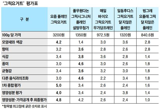 3위는 ‘매일 바이오 그릭요거트 무가당 플레인’(2.6점)이었다. 무난하고 대중적이라 호불호가 갈리지 않는 제품이라는 게 공통된 견해였다. 모양새와 색감, 식감 등에서 두루 호평받았다. 이택구 셰프는 “가장 대중적인 맛을 낸 제품”이라며 “입에 착착 붙고 영양도 고루 좋았으며 무난하게 시도해볼 만한 그릭요거트였다”고 평가했다. 노윤지 셰프는 “꾸덕함이 아쉽지만 그 밖에는 그릭요거트라는 이미지에 맞아 떨어지는 제품이었다”며 “플레인 요거트를 선호하는 분들에게 적합한 제품일 것 같다”고 말했다.