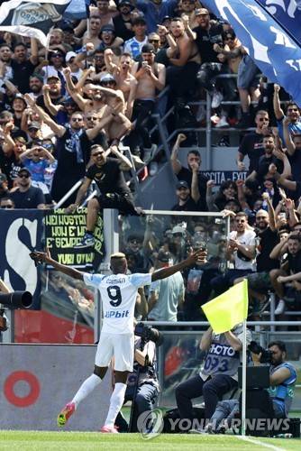 epa10659997 Napoli's Victor Osimhen jubilates after scoring a goal during the Italian Serie A soccer match Bologna FC vs SSC Napoli at Renato Dall'Ara stadium in Bologna, Italy, 28 May 2023. EPA/ELISABETTA BARACCHI