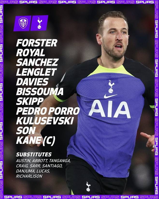 토트넘은 오는 29일 0시 30분에 영국 리즈 앨런드 로드에서 열리는 2022/23시즌 프리미어리그 38라운드 리즈 유나이티드 원정 경기를 앞두고 선발 명단을 발표했다.