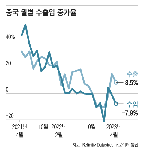 4월 중국의 수입이 -7.9%를 기록했다는 게 사실 숨어 있는 포인트에요. 소비가 잘 되고 공장이 잘 돌아간다면 당연히 수입이 늘어야 할 텐데, 마이너스 성장을 기록한 겁니다. 위안화 환율이 심리적 저지선인 ‘1달러=7위안’을 넘어선 데는 이런 중국 경제 실상에 대한 투자자들의 냉정한 판단이 작용했다고 볼 수 있어요.