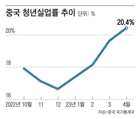 제로 코로나가 중국 경제에 남긴 또 하나의 큰 그림자는 청년실업률이에요. 올 들어 매월 상승해온 청년실업률은 4월 20.4%까지 치솟았습니다. 2019년만 해도 높아도 13%를 넘지 않았던 청년실업률이 코로나 19를 거치면서 걷잡을 수 없이 올라가는 형국이에요.