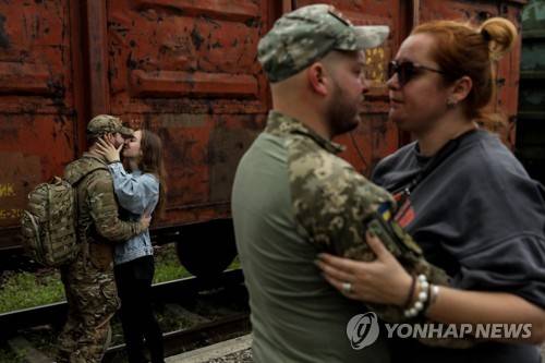 epaselect epa10660065 Couples bid each other farewell at the railway station in Kramatorsk, Donetsk region, Ukraine, 28 May 2023. Under martial law, Ukrainian servicemen are entitled to 10 days of vacation per year. Some of their family members travel to areas closer to the frontline to make the most out of the short time they have available to spend with servicemen, while they?re on a rotational leave. Russian troops entered Ukraine in February 2022, starting a conflict that has provoked destruction and a humanitarian crisis. EPA/OLEG PETRASYUK