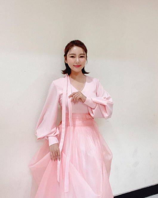 공개된 사진은 연분홍색 한복을 입은 송가인의 모습.
