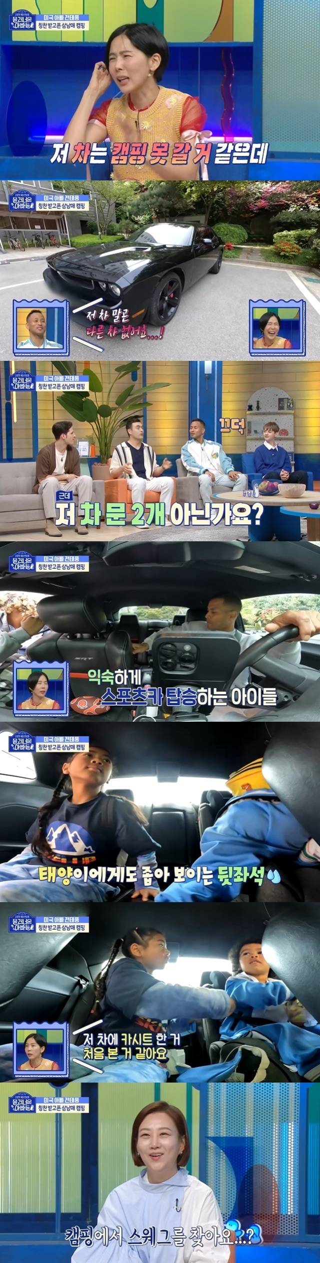 전태풍의 "그럼 어떡하냐. 다른 차가 없다"는 답에 인교진은 "보통 애들이 셋이면 차를 (큰 차로) 바꾸지 않냐"고 캠핑 이전의 문제를 짚었다. 하지만 전태풍은 "전 그런 스타일 아빠가 아니다. 애들이 제 스타일에 맞춰야 한다"고 당당히 주장, 심지어 문이 두 개뿐인 스포츠카 아니냐는 질문에 "근데 뒷자리가 생각보다 진짜 넓다"고 밝혔다.
