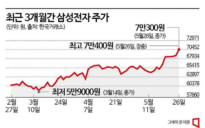 이튿날인 26일에도 삼성전자는 상승랠리를 이어가며 7만원대에 안착, 종가도 7만300원에서 장을 마쳤습니다.