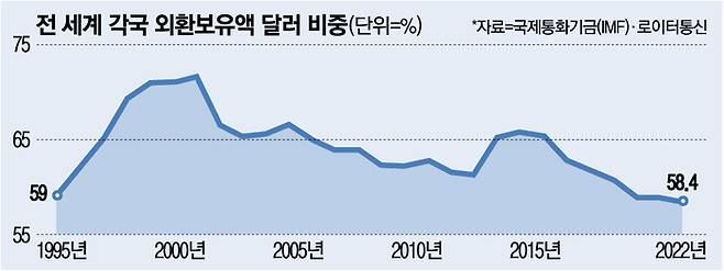 최근 로이터통신은 국제통화기금(IMF)의 자료를 인용해 세계 각국 중앙은행의 외환보유고에서 달러 비중은 지난해 4분기 58%를 기록했다고 보도했다. 1995년 59% 이후 약 20년 만에 최저치로 추락했다. 로이터통신은 미중 경쟁과 우크라이나 전쟁, 미국 연방정부의 부채한도 위기가 이같은 추세를 이끌었으며 서방의 대러시아 금융 제재 등이 달러화 비중을 하락을 부채질 했다고 분석했다. 스테픈 젠 유리존 SLJ 캐피털 최고경영자(CEO)는 로이터통신에 “지난해 달러 비중이 급격히 하락한 것은 우크라이나 침공 후 러시아의 금과 외화 자산 6400억 달러 중 절반이 동결된데 따른 반응”이라고 밝혔다.