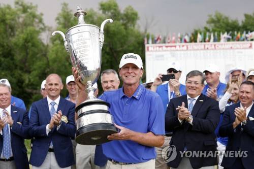 Steve Stricker, of the United States, raises the Bourne Trophy after winning the Senior PGA Championship golf tournament at Fields Ranch East at PGA of America in Frisco, Texas, Sunday, May 28, 2023. Stricker defeated Padraig Harrington, of Ireland, in a playoff. (Elías Valverde II/The Dallas Morning News via AP) MANDATORY CREDIT; NO LICENSING EXCEPT BY AP COOPERATIVE MEMBERS