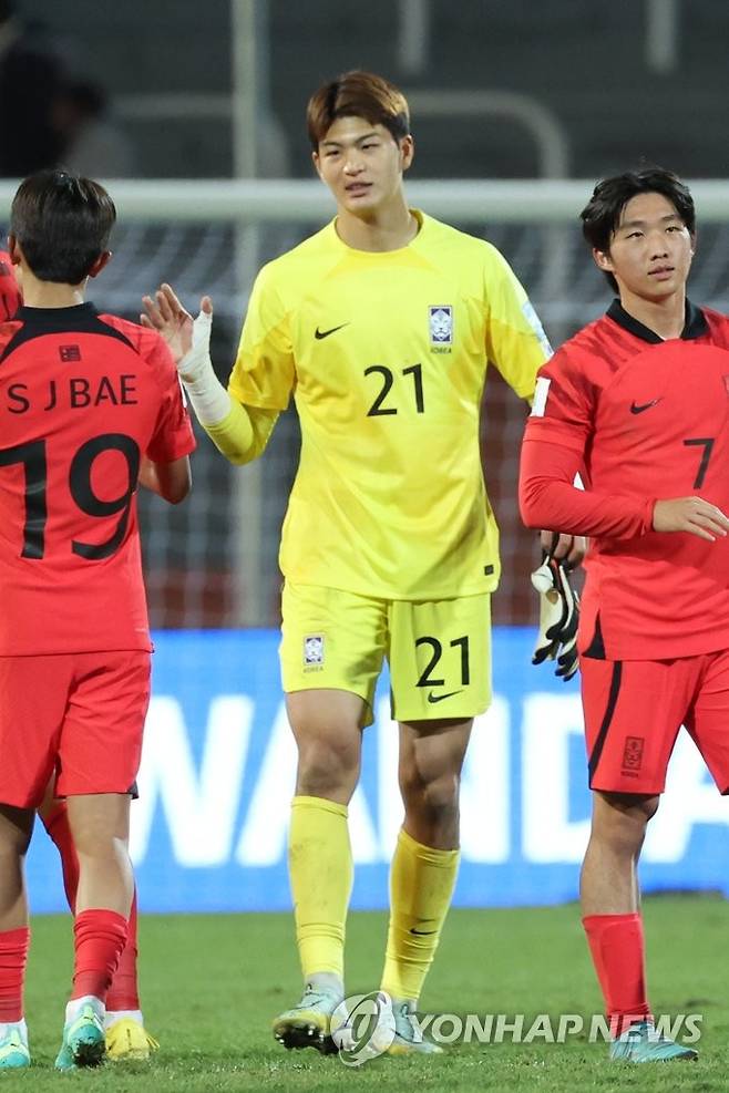 (멘도사=연합뉴스) 임화영 기자 = 28일(현지시간) 오후 아르헨티나 멘도사 스타디움에서 열린 2023 국제축구연맹(FIFA) 20세 이하(U-20) 월드컵 조별리그 F조 3차전 한국과 감비아의 경기에서 첫 무실점 경기를 이끈 '백업 수문장' 문현호가 경기 종료 후 선수들과 기뻐하고 있다. 2023.5.29