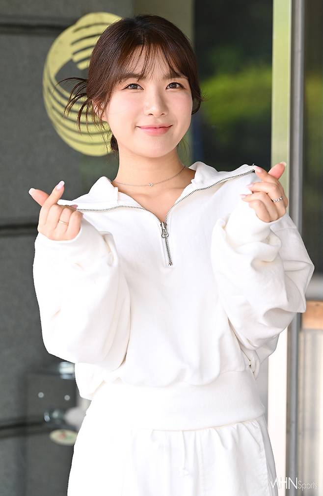 류원정이 하트 포즈를 취하고 있다.