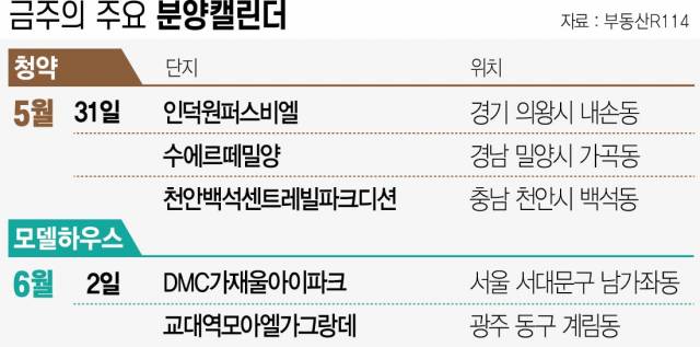 주요 분양 단지로는 경기 의왕시 내손동 '인덕원퍼스비엘'과 충남 천안시 백석동 '천안백석센트레빌파크디션', 경남 밀양시 가곡동 '수에르떼밀양' 등이다.