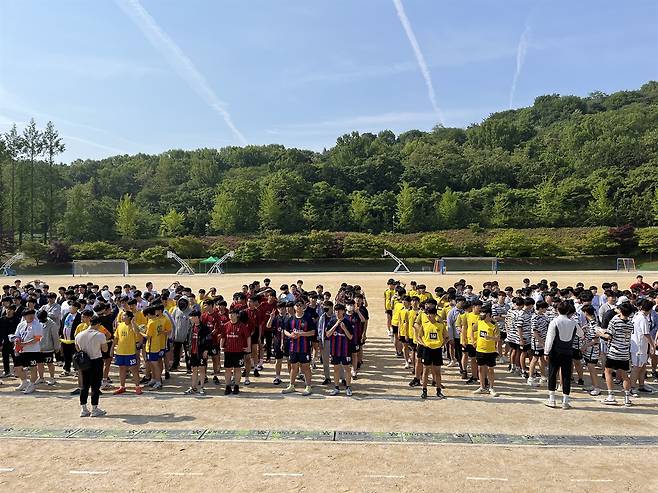 반티 차림으로 줄 선 아이들의 모습으로만 보면, 운동장은 흡사 월드컵이나 유럽 챔피언스 리그를 치르는 경기장 같다. 한편으론 형형색색 알록달록한 게 화사한 봄꽃들이 만개해있는 모습 같기도 하다. 솔직히 체육대회가 아니면 이렇듯 활기찬 아이들의 모습을 기대하긴 힘들다.